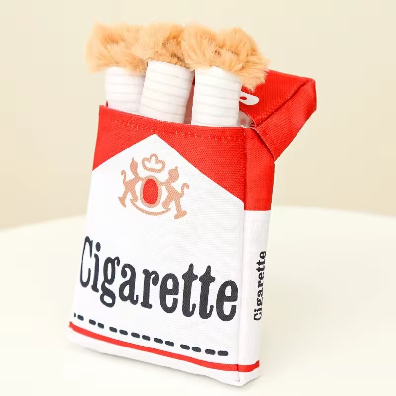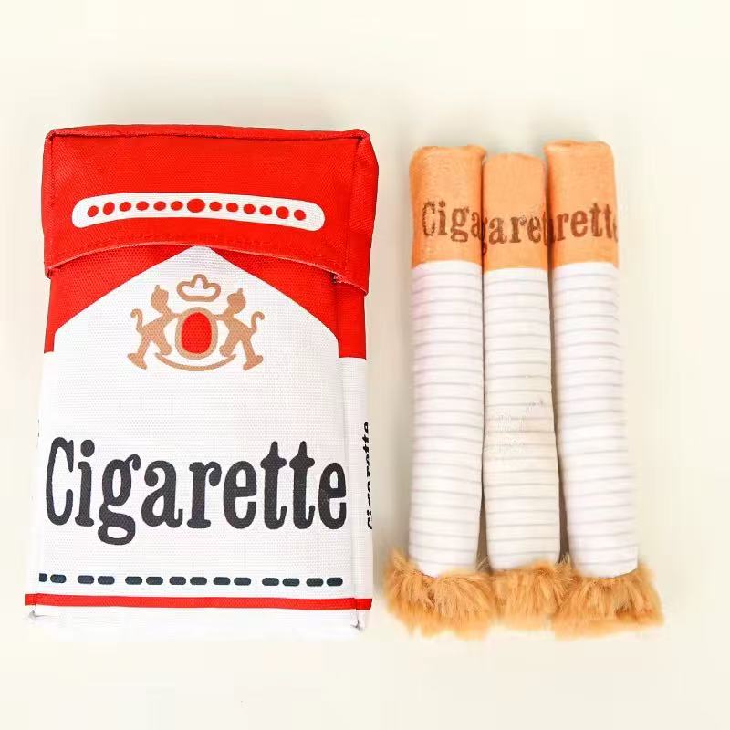 This novelty cigarette plush squeaky dog toy set is designed as a fun cigarette pack with soft plush cigarette toys inside. The creative design makes it a funny and eye-catching pet toy for dogs, pet stores, online shops, and wholesale pet product suppliers.